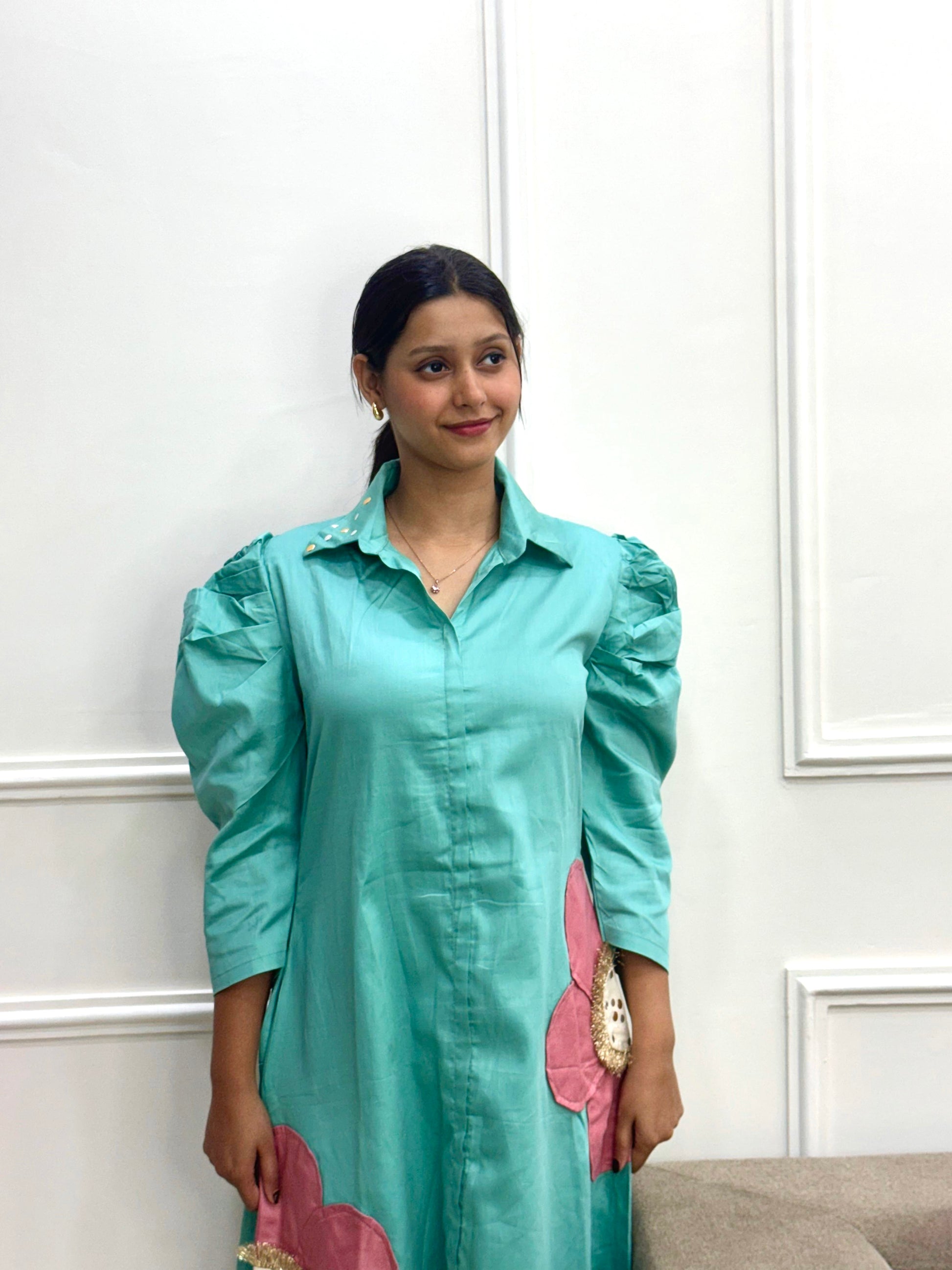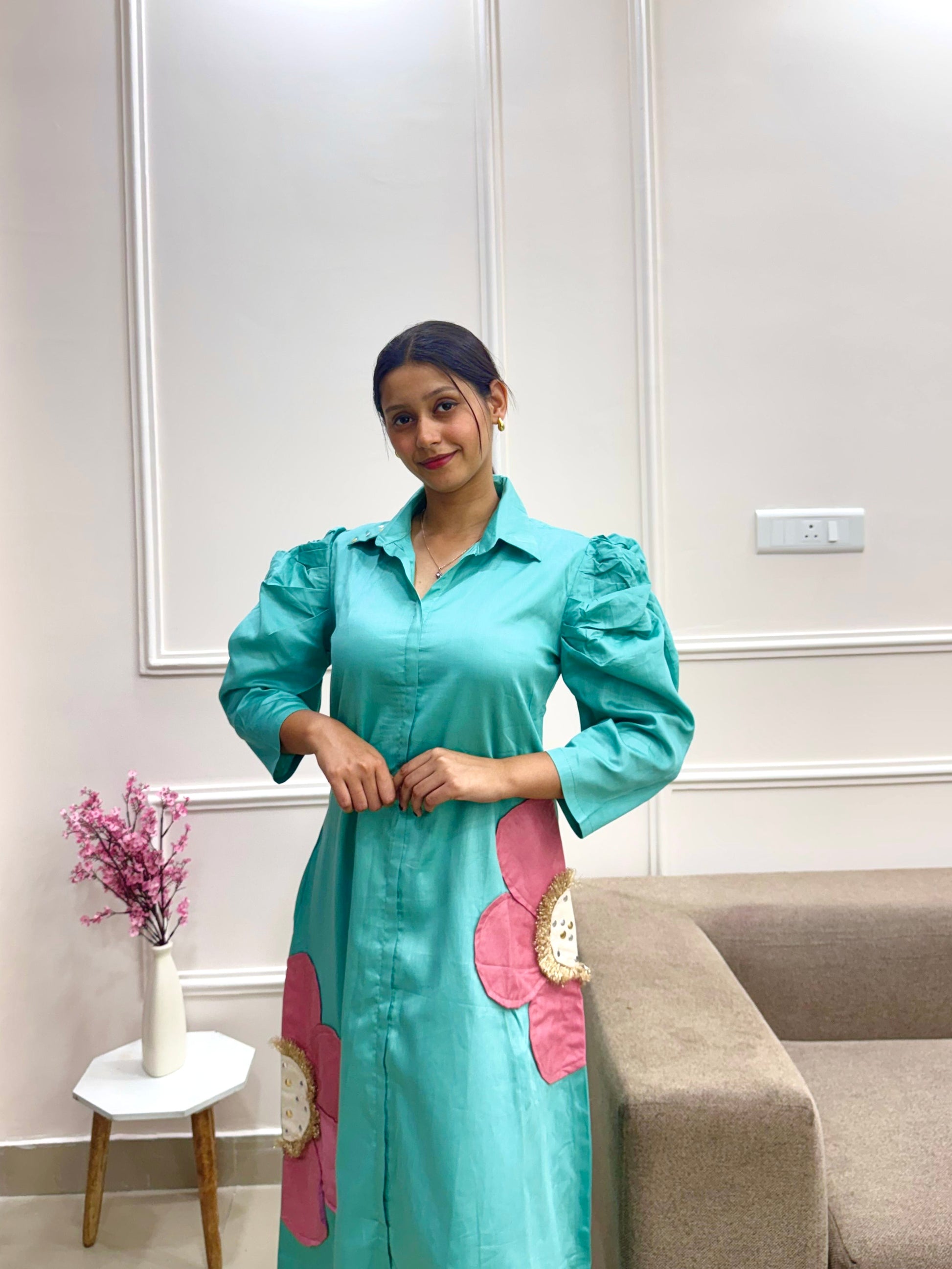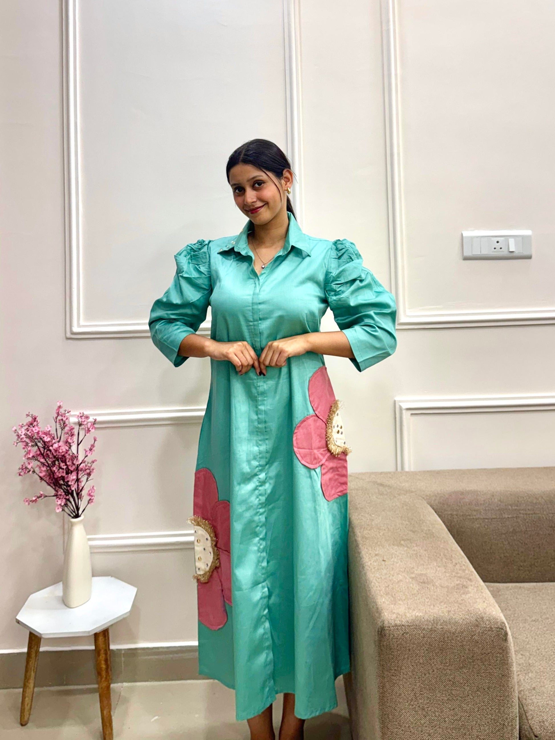 Step into effortless charm with our Bloom Midi Dress – featuring statement puff sleeves, a flattering shirt collar, and playful oversized floral appliqués that add a touch of whimsy. Crafted in a breezy aqua green cotton blend, this dress is your go-to for comfort with style.