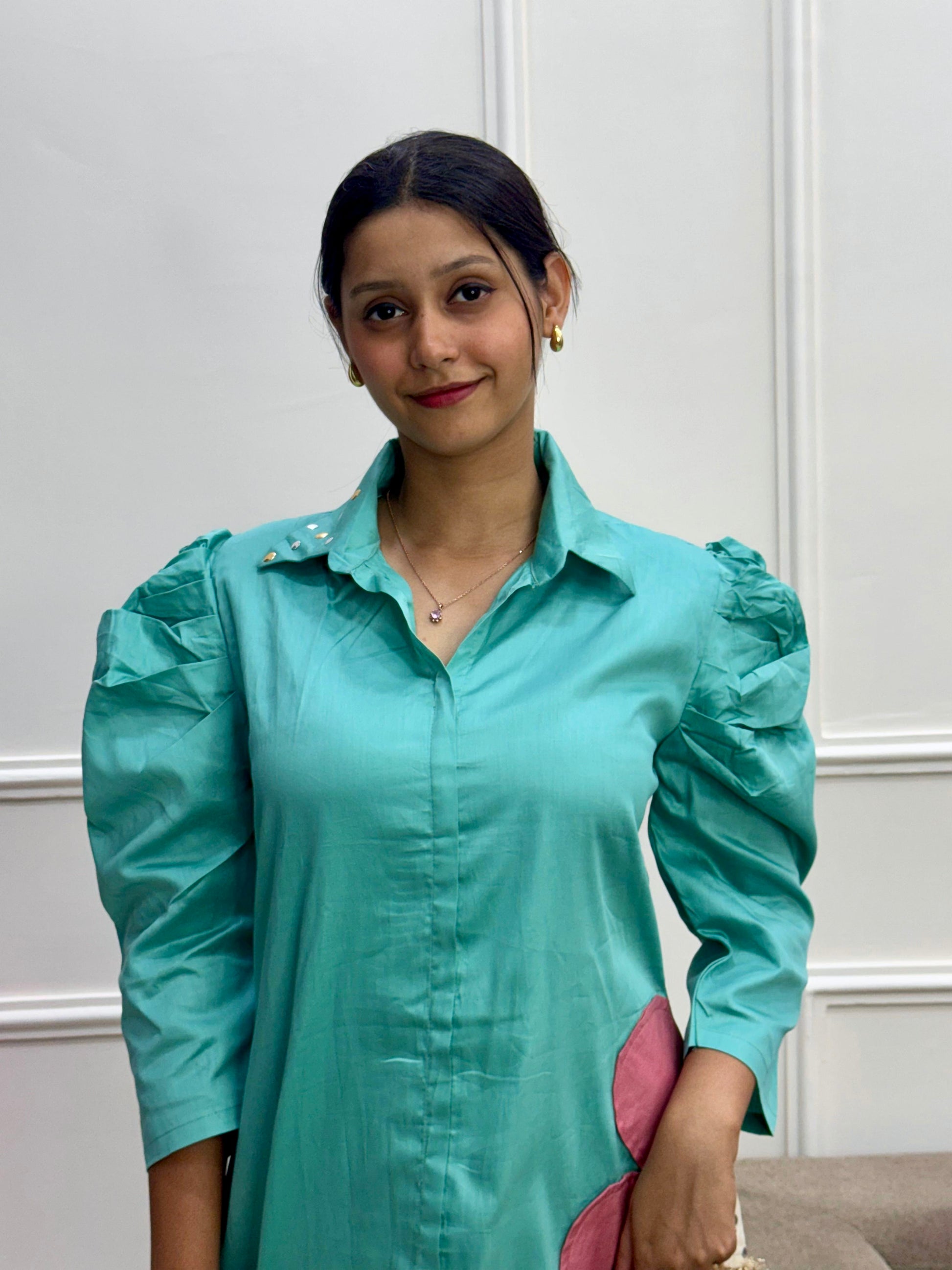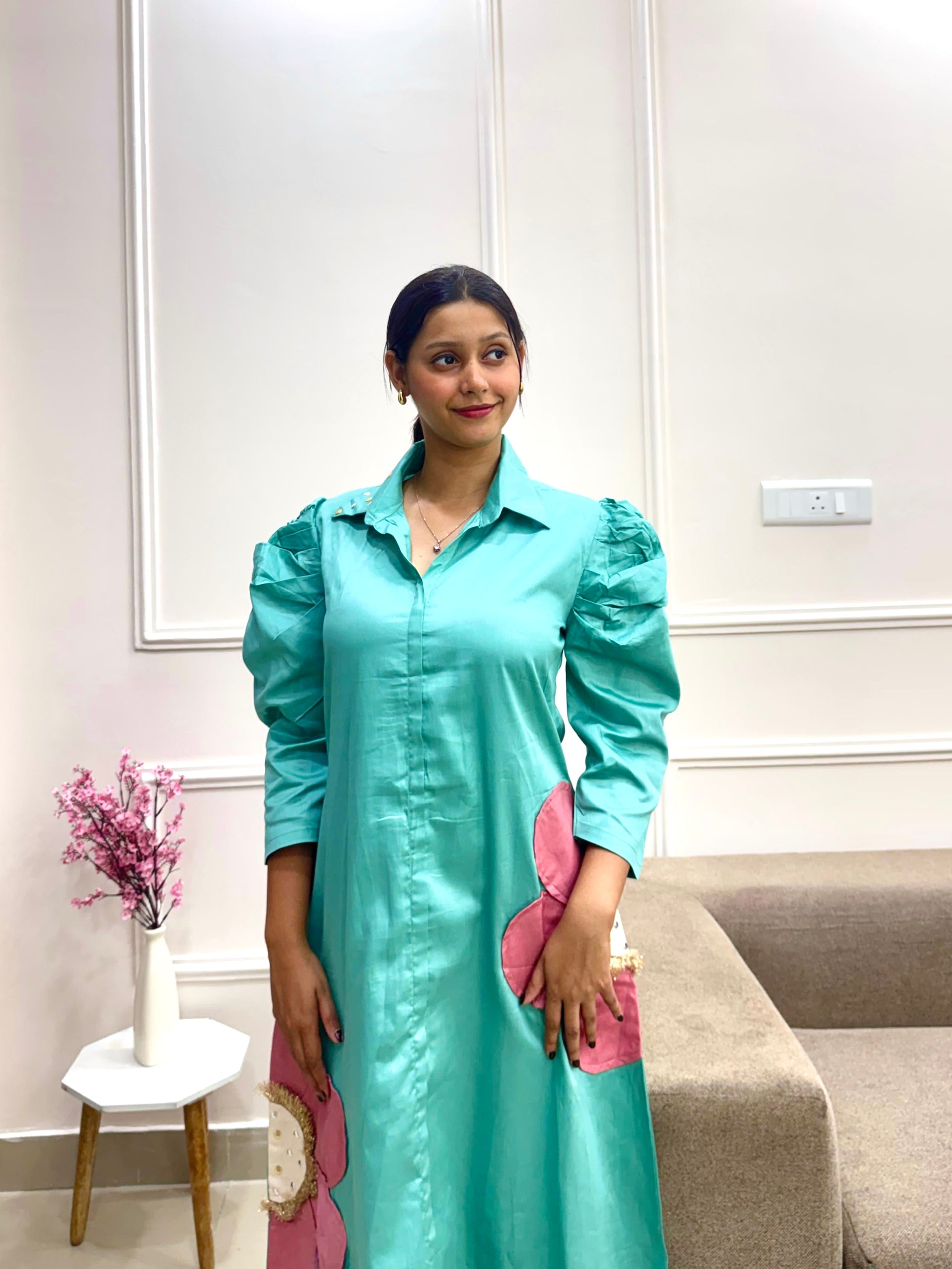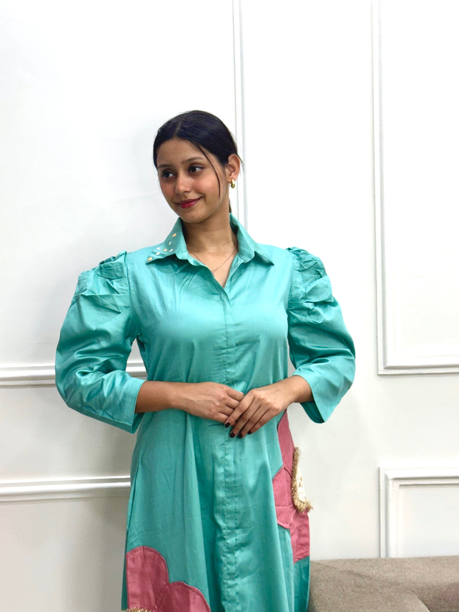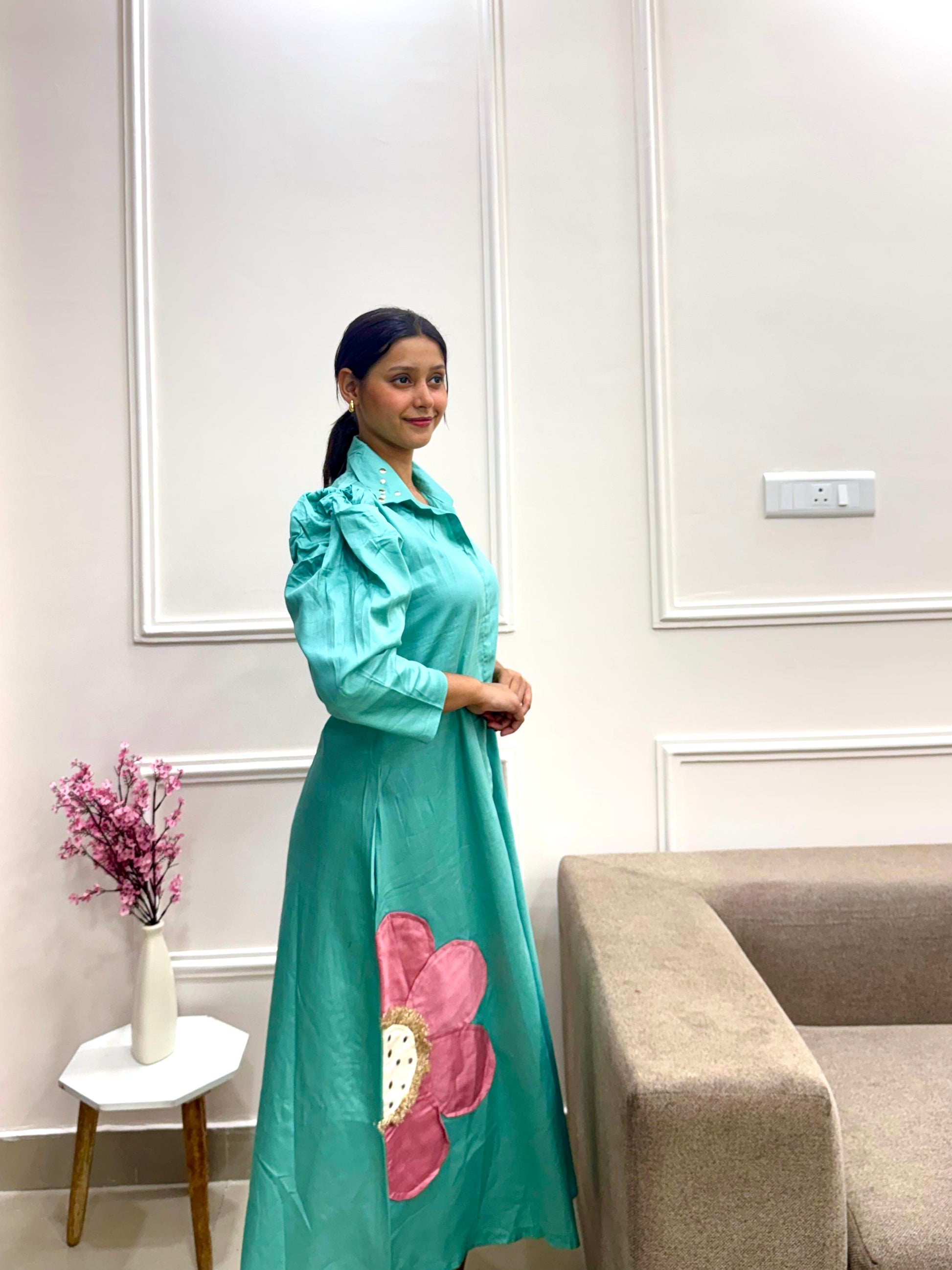 Step into effortless charm with our Bloom Midi Dress – featuring statement puff sleeves, a flattering shirt collar, and playful oversized floral appliqués that add a touch of whimsy. Crafted in a breezy aqua green cotton blend, this dress is your go-to for comfort with style.